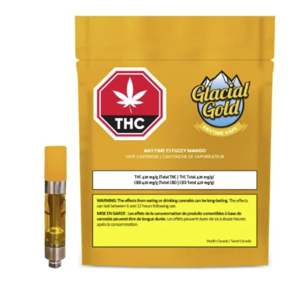 Anytime 1:1 Vape has a balanced CBD and THC profile. Fuzzy Mango features tropical notes of African mangoes and tree fruits. The mild botanical terpenes are naturally derived from plant compounds, nothing artificial, and no additives. Glacial Gold distillate is processed through a patented closed loop, chilled-alcohol extraction method. Cartridges are made with stainless steel components and a ceramic atomizer.