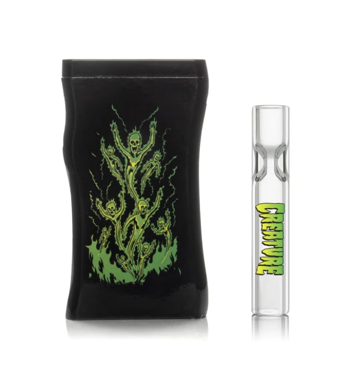 Dance with the devil and experience the fiery Hell Dugout from Creature x GEAR Premium®. Take your smoke sesh to-go with a 100% borosilicate glass taster included in every dugout. Bring your reefer on the road and try one today!